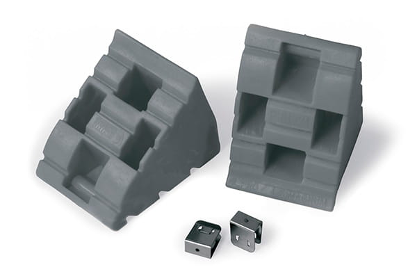 Zestaw 2 klocków zabezpieczających koła podczas długich postojów. Dostarczane standardowo ze stalowymi haczykami do pewnego mocowania dwóch klinów, gdy są używane na poziomach. Solidna konstrukcja z polietylenu odpornego na promieniowanie UV. Kolor: szary.