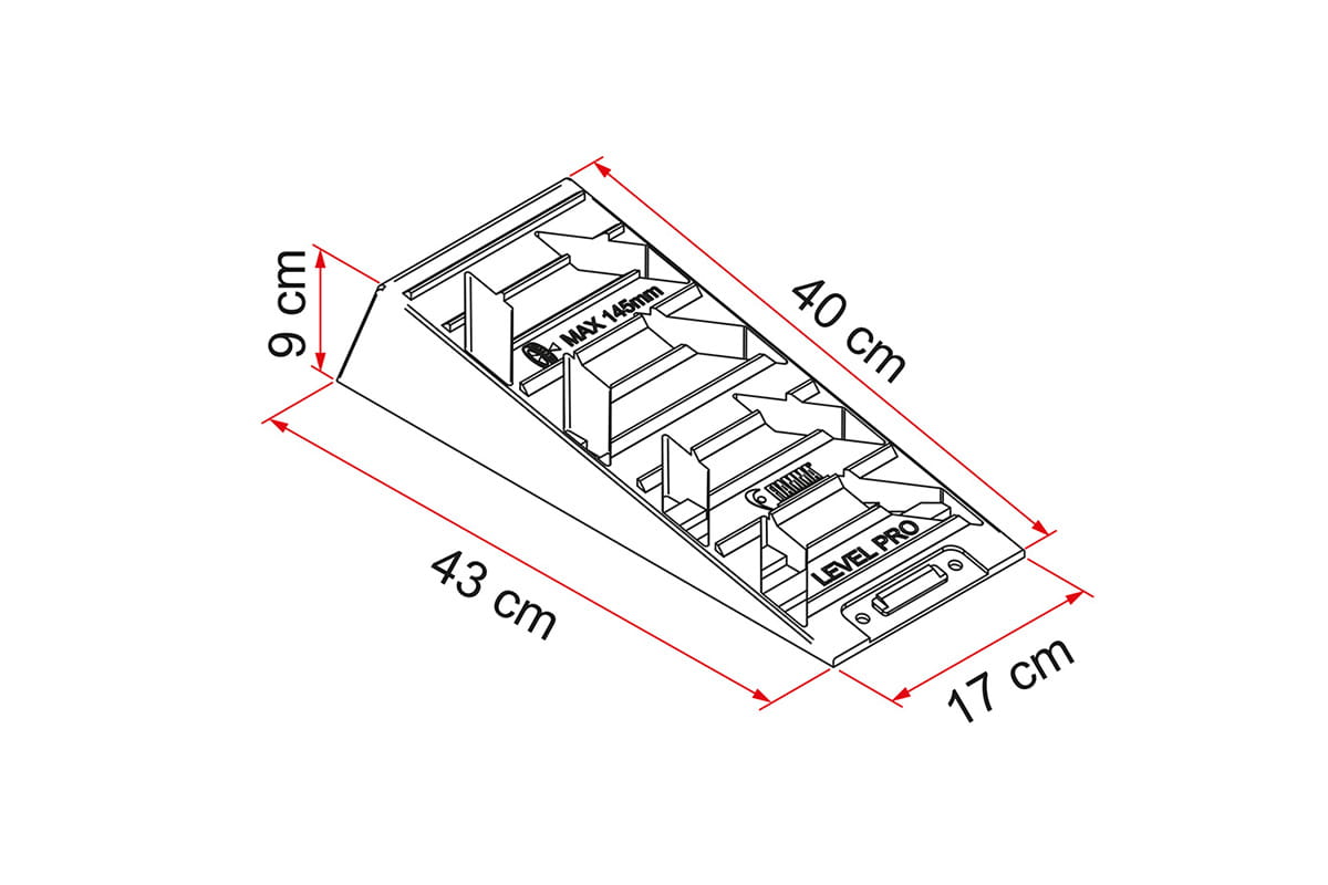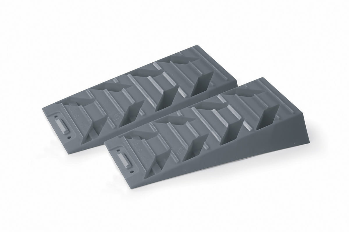 Klin o innowacyjnej konstrukcji, idealny do przyczep kempingowych i pojazdów o małych kołach. Solidna konstrukcja z polietylenu HD odpornego na promieniowanie UV. Praktyczny samoblokujący system zakładek.