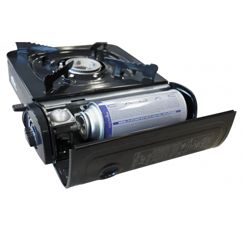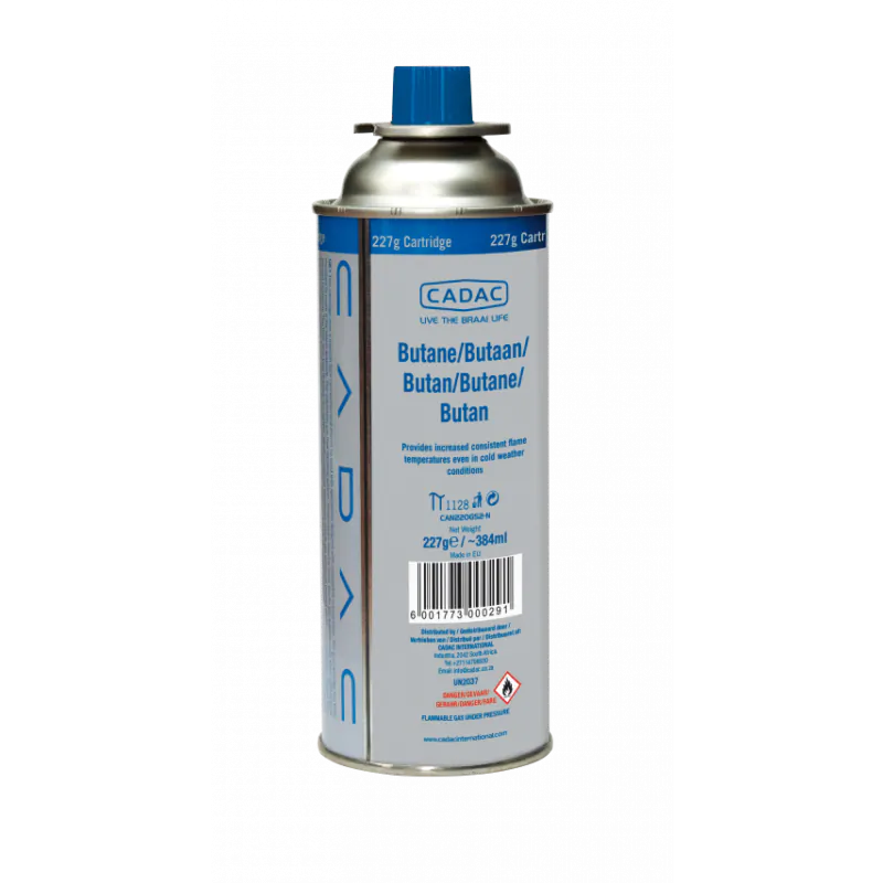 Kartusz CADAC ze 100% mieszanki gazu butan. Zawrtość gazu w kartusz: 227 gram. Wyposażony jest w zawór SSN-29 oraz osłonę zabezpieczającą. Funkcja „wciśnij i przekręć” ułatwia umieszczanie kartusza w kuchence.