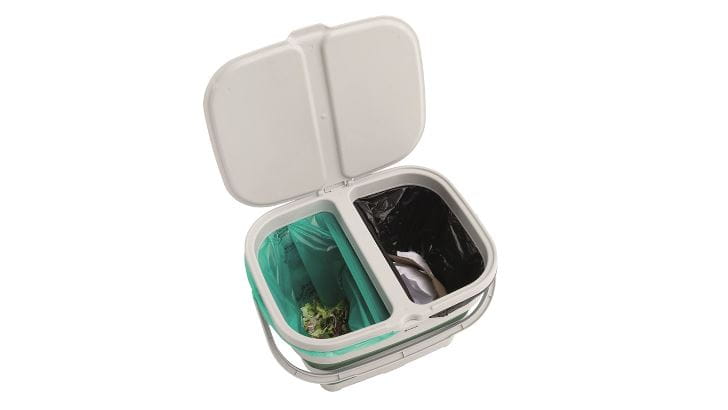 Dwukomorowy kosz Collaps Recycleit Basket z pokrywką umożliwia sortowanie odpadów w workach dla wygody, jednocześnie eliminując zapachy i owady. Zdejmij pokrywę i obręcz, aby wykorzystać je jako kosz lub złóż, aby zaoszczędzić miejsce, gdy nie są używane.