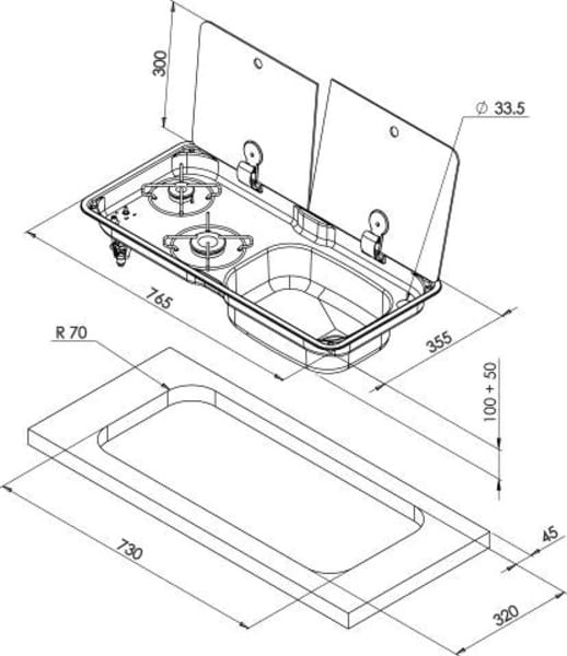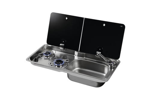 Dwupalnikowa kuchenka-zlewozmywak ze szklaną pokrywą.