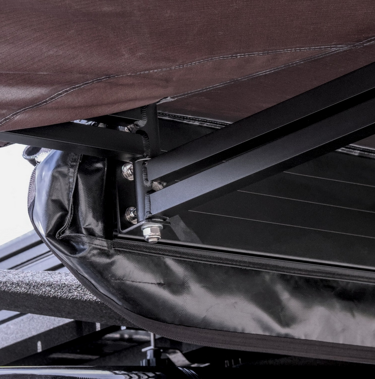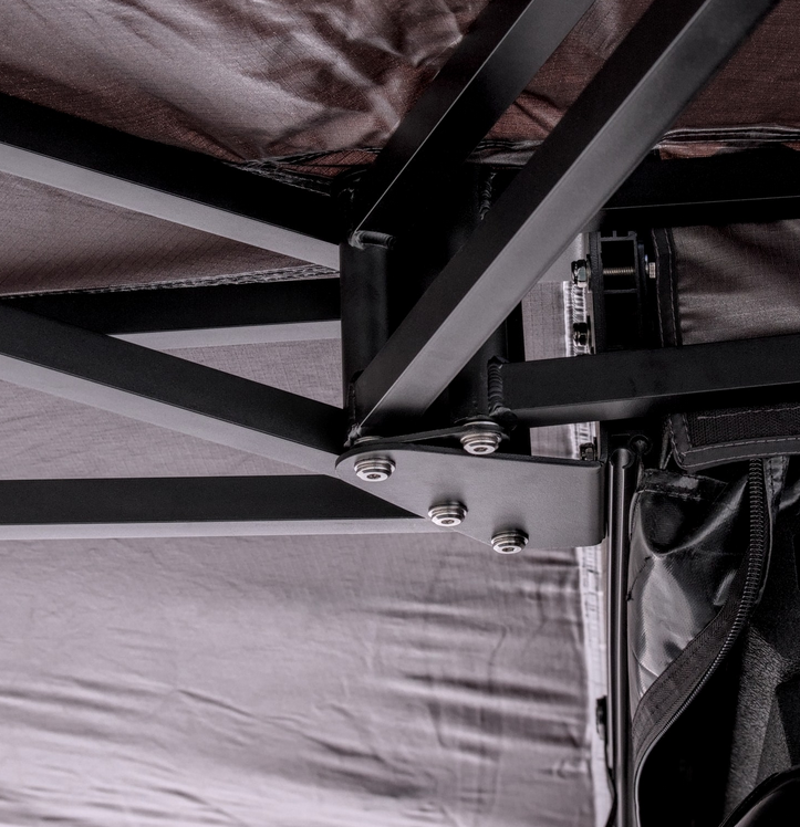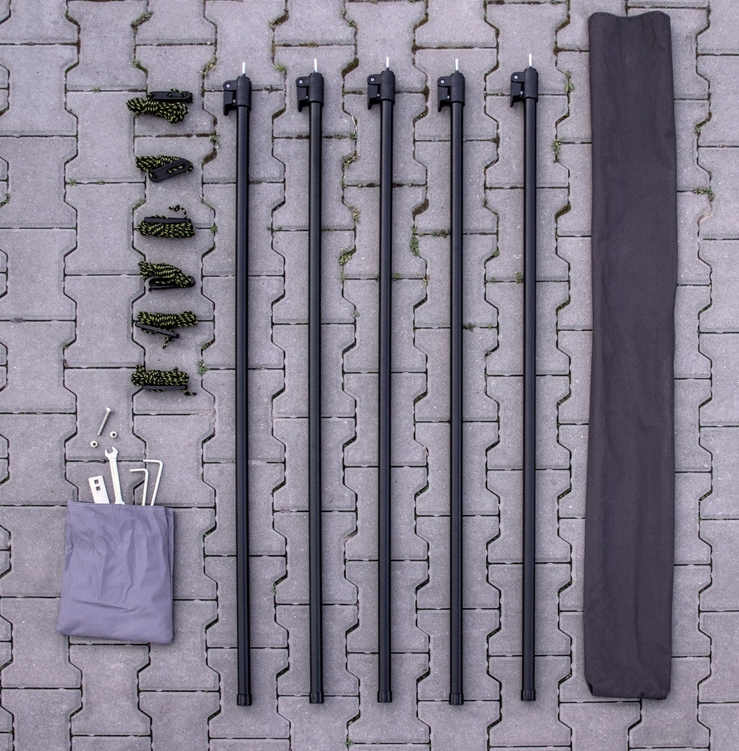 Montaż zadaszenia jest szybki i intuicyjny – wystarczy przymocować je do platformy dachowej po stronie kierowcy za pomocą dołączonych uchwytów. Całość znajduje się w wodoodpornym pokrowcu zapinanym na zamek, co ułatwia transport i przechowywanie. Konstrukcja została zaprojektowana tak, aby mogła być rozkładana przez jedną osobę, co czyni ją niezwykle praktycznym rozwiązaniem na każdą podróż.