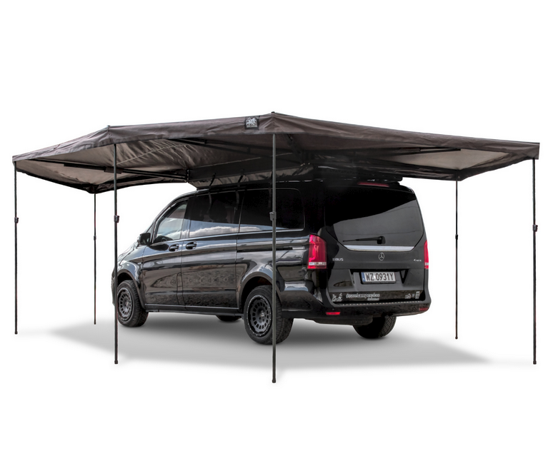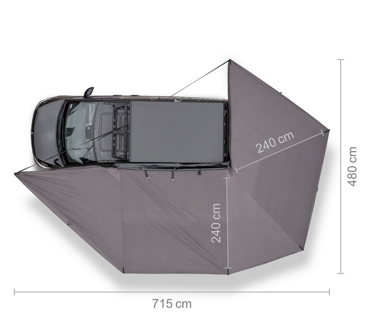 MEGAWING 270 XXL oferuje rozpiętość 270 stopni, co pozwala na swobodne korzystanie z przestrzeni bagażowej nawet podczas ulewy. Może działać jako konstrukcja wolnostojąca, a w przypadku silniejszego wiatru wystarczy skorzystać z dołączonych do zestawu słupków podporowych z blokadą. Dodatkowe linki napinające pomagają precyzyjnie ustabilizować materiał, zapewniając jeszcze większą odporność na warunki atmosferyczne.