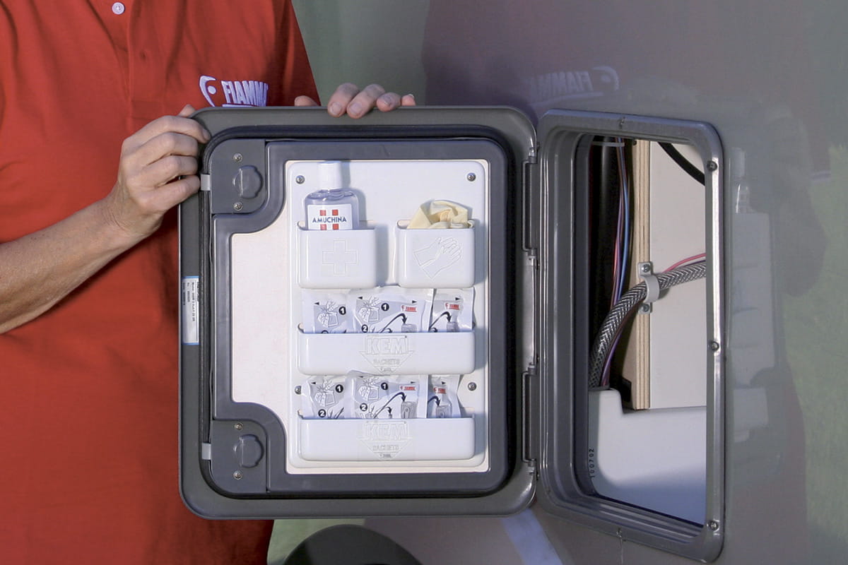 Składa się z czterech indywidualnych kieszeni do przechowywania. Można go przymocować za pomocą śrub, które są dostarczane w standardzie wewnątrz drzwi Thetford lub Dometic Cassette pojazdu.