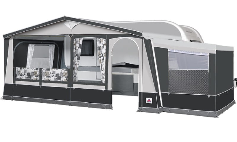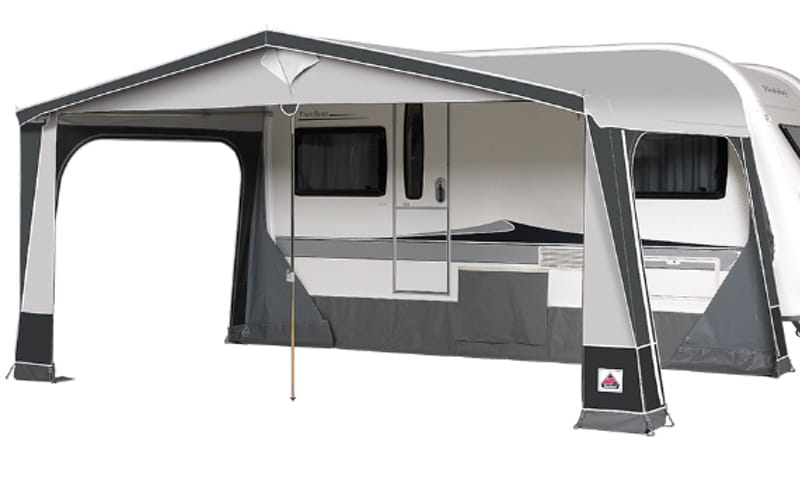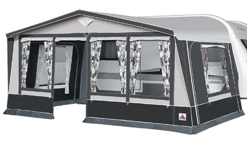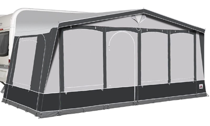 Wygodny i niedrogi przedsionek o głębokości 240 cm. IBIZA 240 i IBIZA 240 De Luxe są wykonane z dwustronnej tkaniny poliestrowej powlekanej PVC - zarówno ścianki boczne, jak i cały dach. Wymienne elementy przedniej ściany umożliwiają idealne wejście. Dzięki specjalnemu mocowaniu dolny fartuch może być umieszczony zarówno wewnątrz, jak i na zewnątrz.