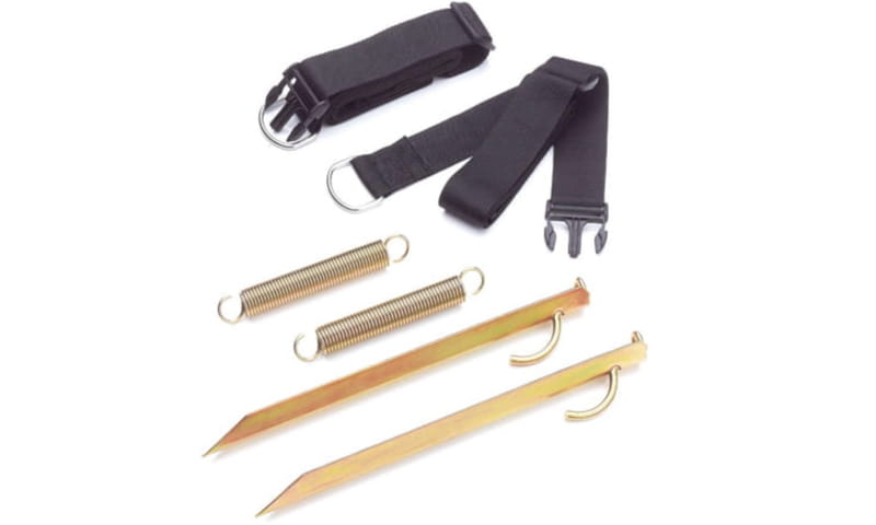 Zestaw składa się z dwóch regulowanych pasów wraz z dwoma śledziami o długości 38 cm i dwoma sprężynami. W namiocie, po lewej i prawej stronie powinny znajdować się gniazda, do których pasują klamry tego zestawu. Szerokość klamry to około: 58 mm.