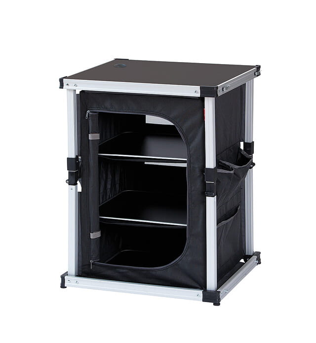 Szafka magazynowa w dwóch rozmiarach ze stabilną technologią składania i przygotowaniem do podłączenia zasilacza typu „pop-up”.