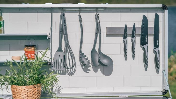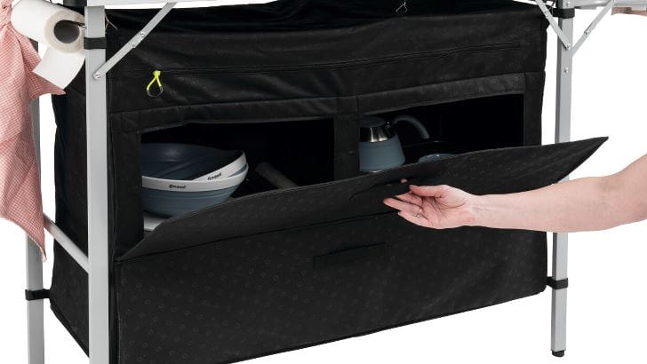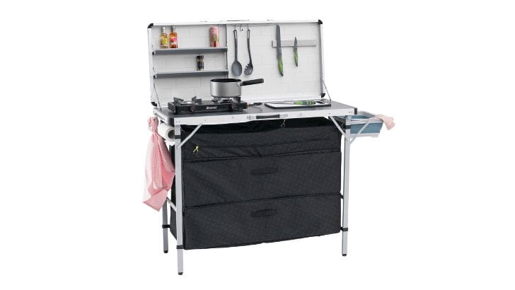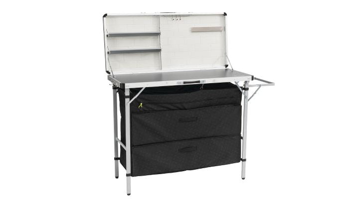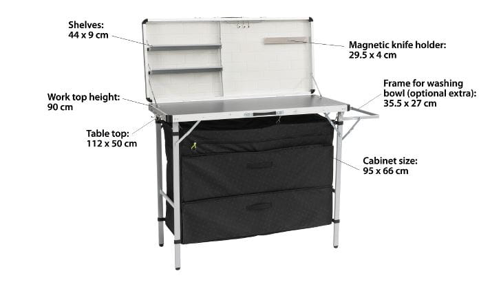 Szafka kuchenna Magante sprawi, że wszystko będzie schludne, schludne i pod ręką. Miejsce do przechowywania w kuchni obozowej zapewniają dwie półki, haczyki i magnetyczny uchwyt na nóż na tylnej ścianie, który nadaje elegancki wygląd płytkom na każdym boisku. Dzięki blatowi o wysokości 90 cm i stabilnej podstawie zapewniamy komfort domowej kuchni podczas przygotowywania posiłków na świeżym powietrzu.
