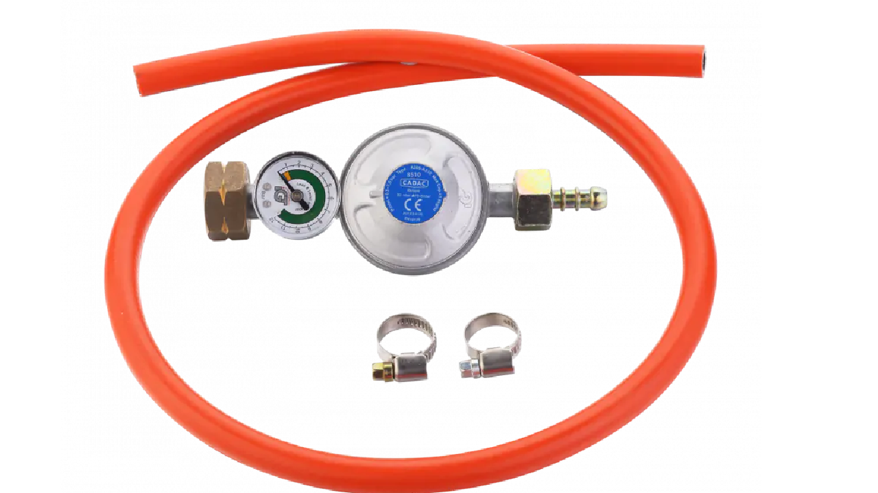 Zestaw składa się z regulatora, manometru cylindrycznego, węża gazowego 85 cm i zacisków węża.