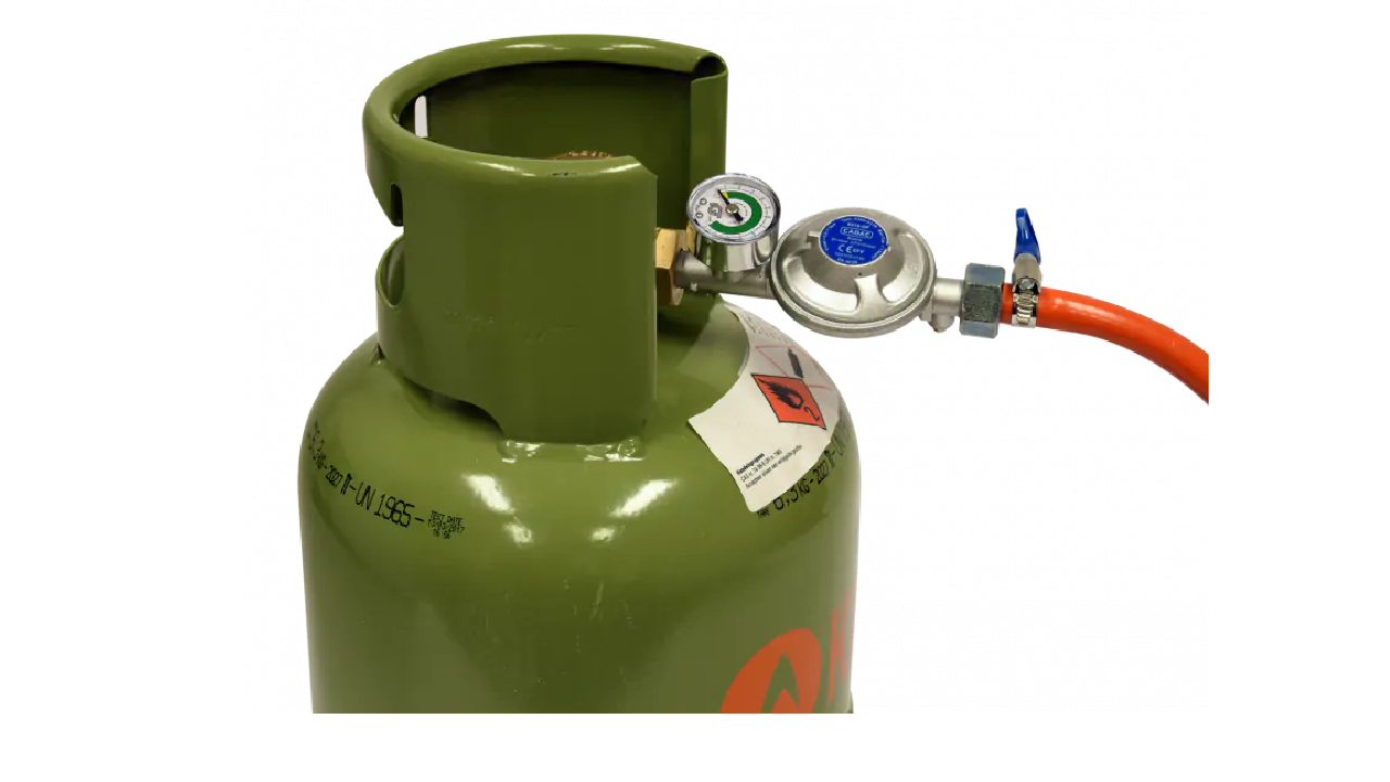 Zestaw z regulatorem i manometrem butli. Za pomocą tego regulatora urządzenia niskociśnieniowe można podłączyć do uniwersalnej butli gazowej. Regulator przelewu automatycznie odcina dopływ gazu, jeśli przewód gazowy jest uszkodzony lub przecieka.